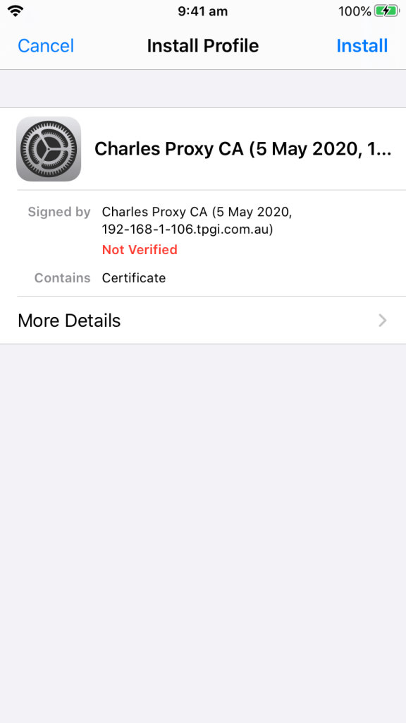 On the device, tap Settings -> General -> VPN & Device Management -> Tap the Charles Proxy certificate -> Install