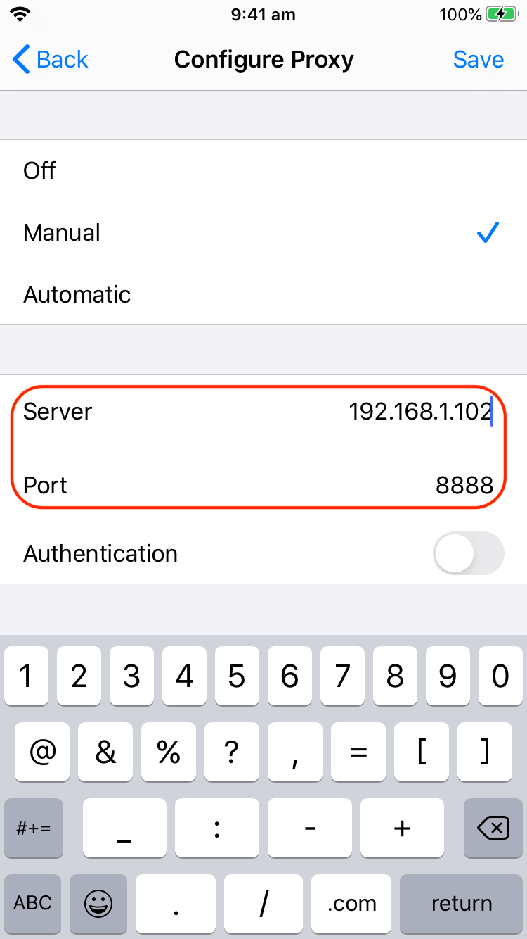 On iOS device, tap Settings -> Wi-Fi -> tap the correct Wi-Fi network -> Configure Proxy -> select “Manual”