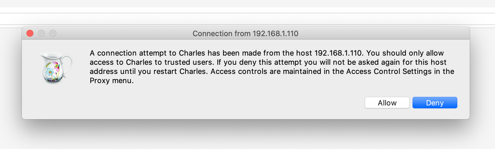 Return to your Mac. You should now see a prompt from Charles. Click “Allow”
