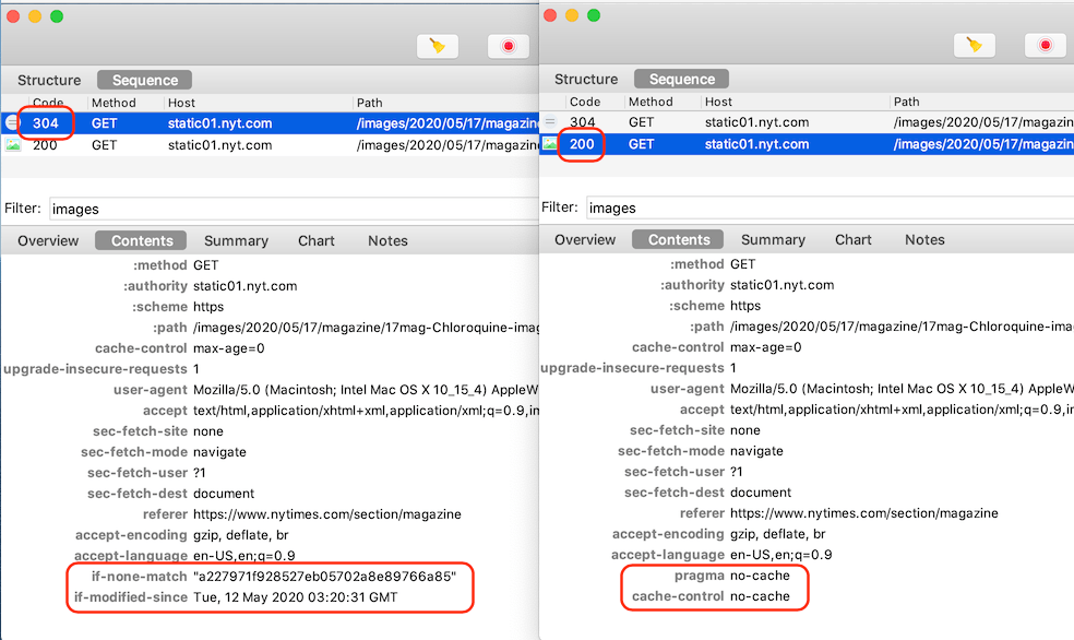 As you can see from the screenshot, Charles swaps 2 headers in the Request (image on the left) with the ‘pragma’ and ‘cache-control’ headers in the second Request (image on the right)