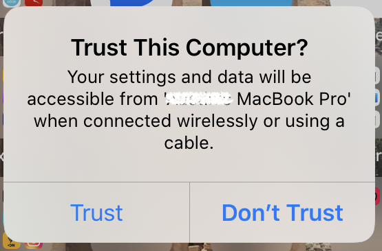Plug your device into your Mac. On your device you should now see this a dialog asking you to trust your MacBook.