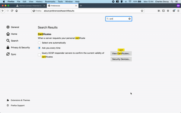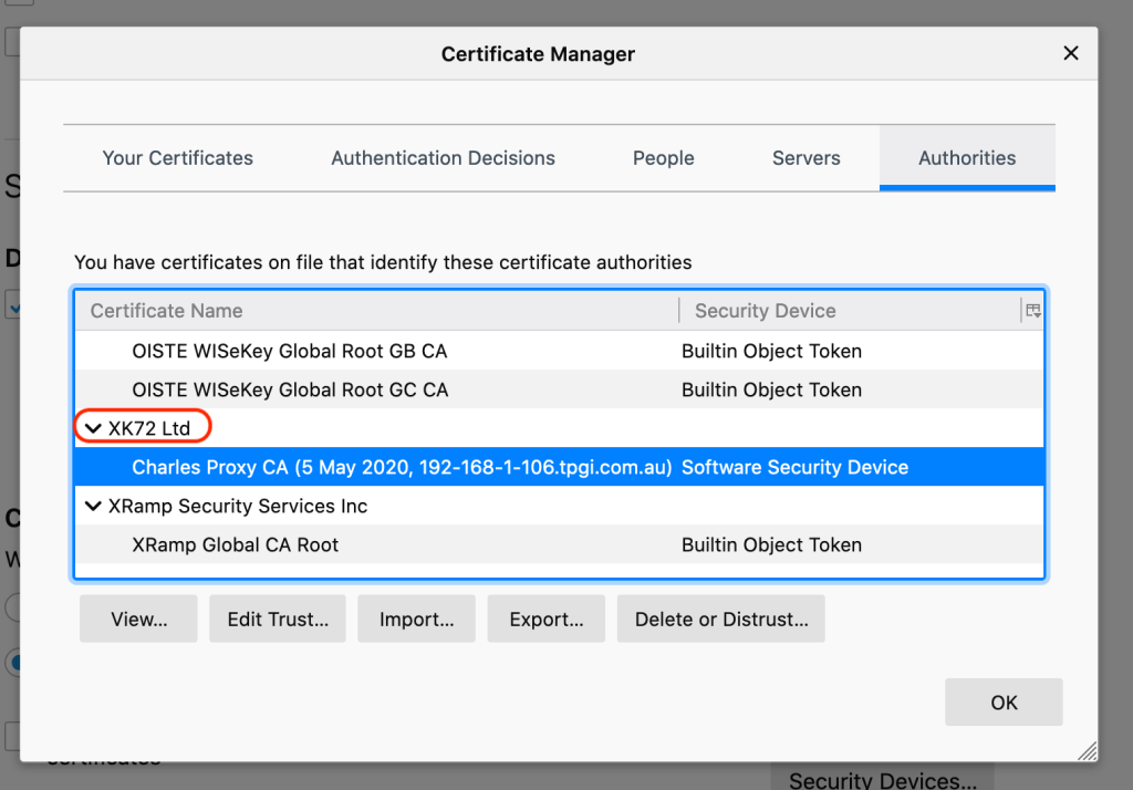 If you want to view decrypted Firefox network traffic in Charles, you need to perform 1 extra task when compared to Chrome and Safari. You need to import the Charles root cert on your machine into Firefox.